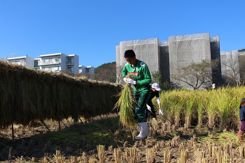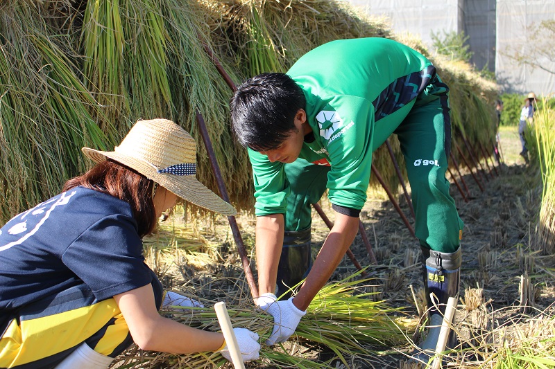 益山選手、太田選手も稲架(はさ)掛けのコツをすぐにつかみ率先して作業を行いました!