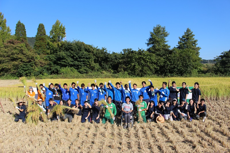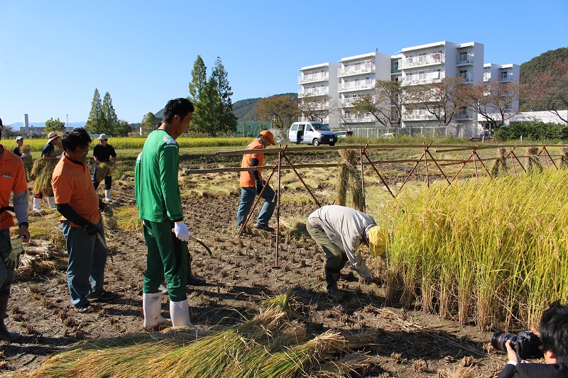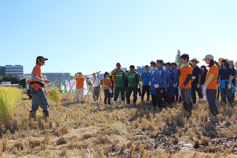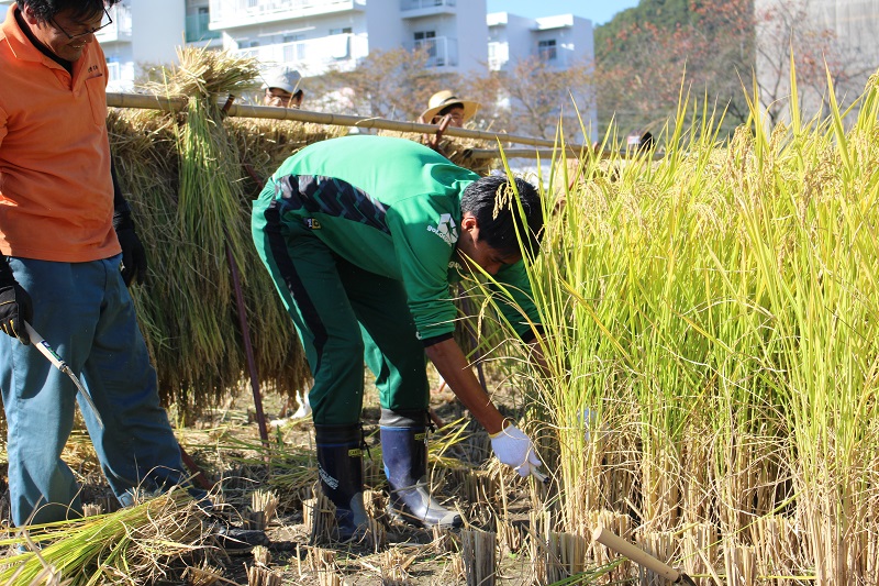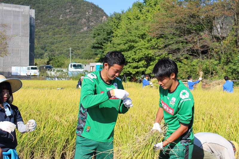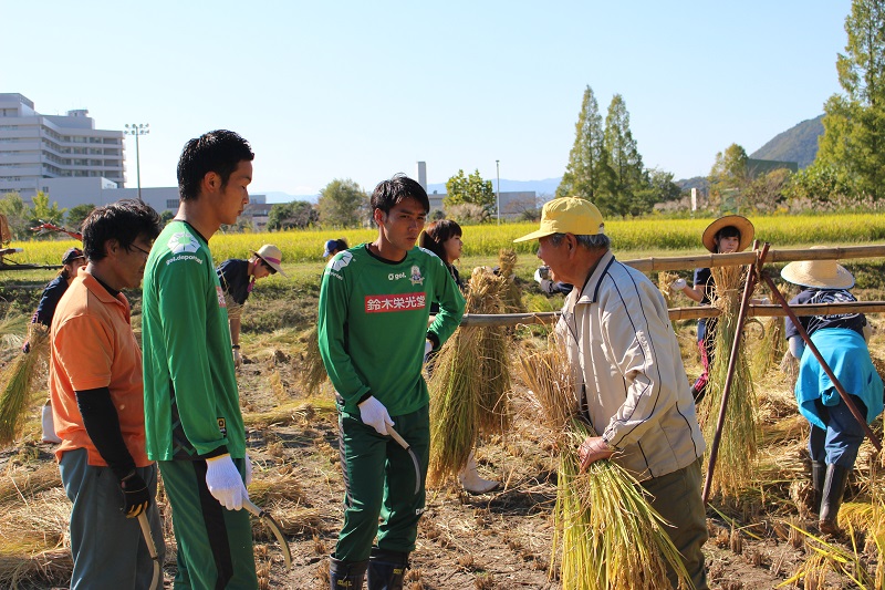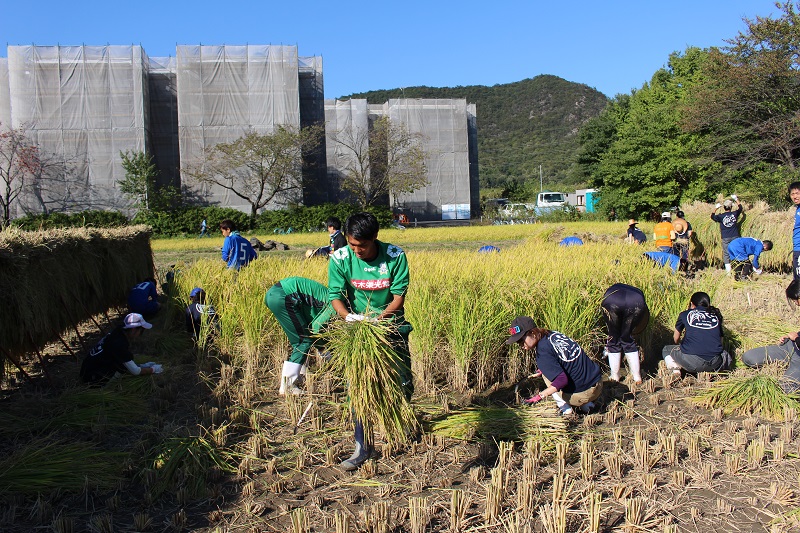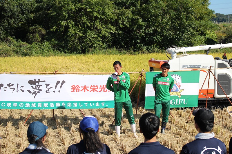 10月14日(水)岐阜市にある岐阜大学応用生物科学部北農場で益山司選手、太田岳志選手による稲刈り、稲架(はさ)掛けが行われました。