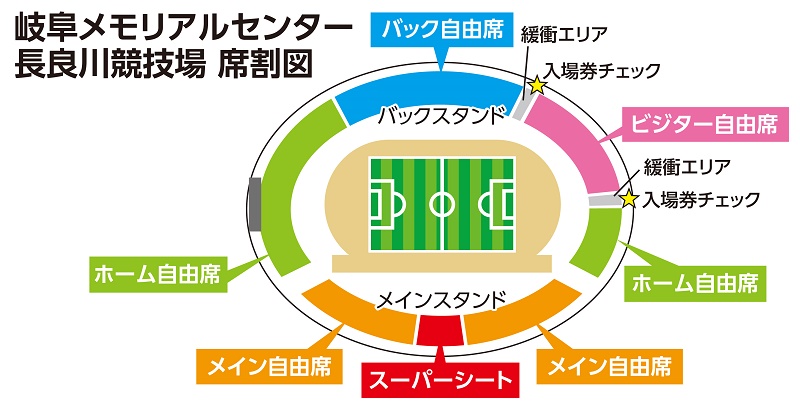 通常の試合においては、FC岐阜グッズを着用されていないお客様につきましては、屋台村・トイレ等の利用のため、緩衝エリア及びビジター自由席エリアのコンコースをご通行いただいておりますが、松本山雅FC戦におきましては、緩衝エリア及びビジター側の通り抜けはできませんのでご注意下さい。