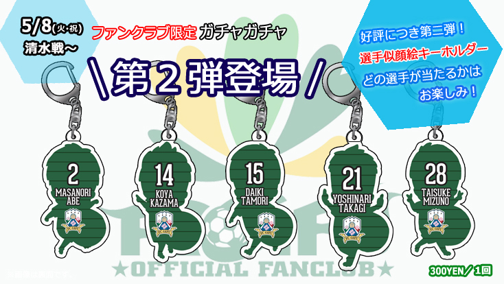 FC岐阜ファンクラブ事務局では、ファンクラブ限定ガチャガチャ『選手似顔絵キーホルダー第2弾』の販売を5月8日(日)清水戦より開始いたしますので、お知らせいたします。