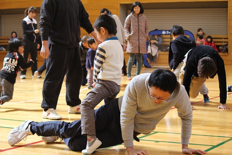 お父さんが通りやすいように子どもたちも足を大きく広げて協力します。