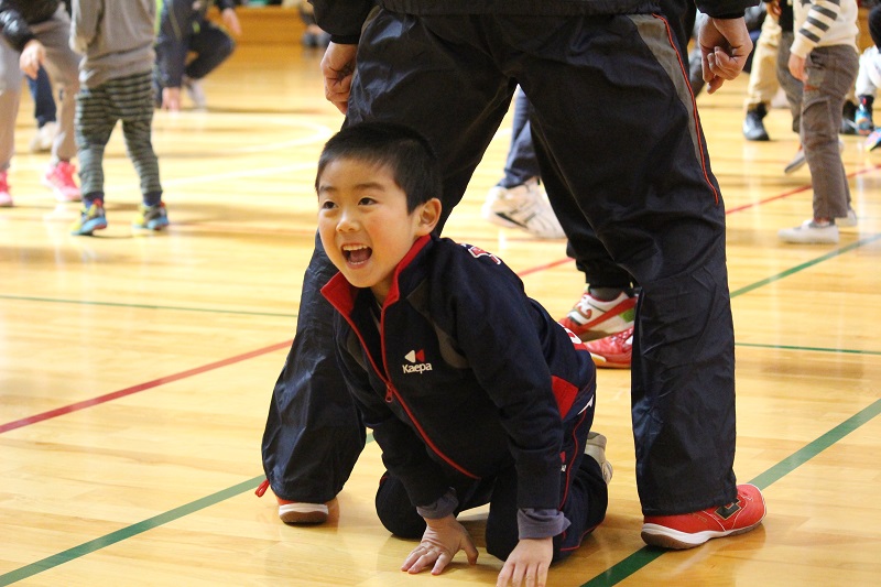 次は1、2年生の部です。こちらもウォーミングアップはじゃんけんです。勝った方は負けた相手の手を握ります。負けた方は手を捕まれないように逃げます。どちらも反射神経が重要です!