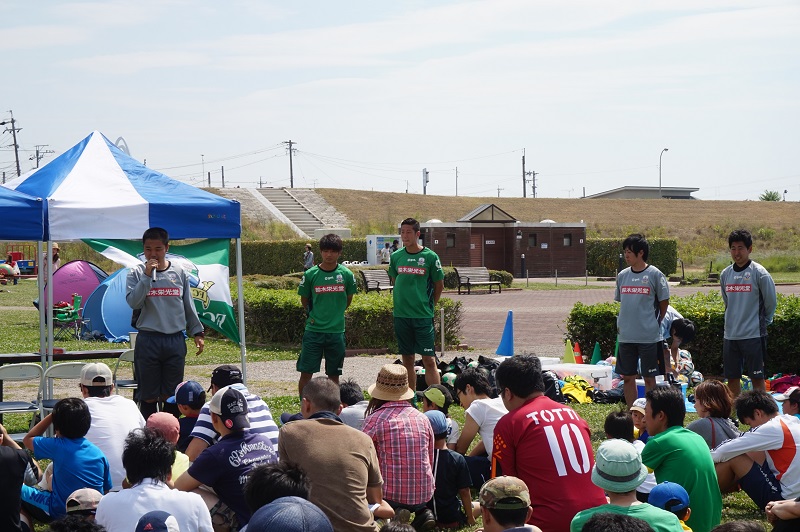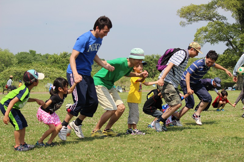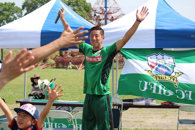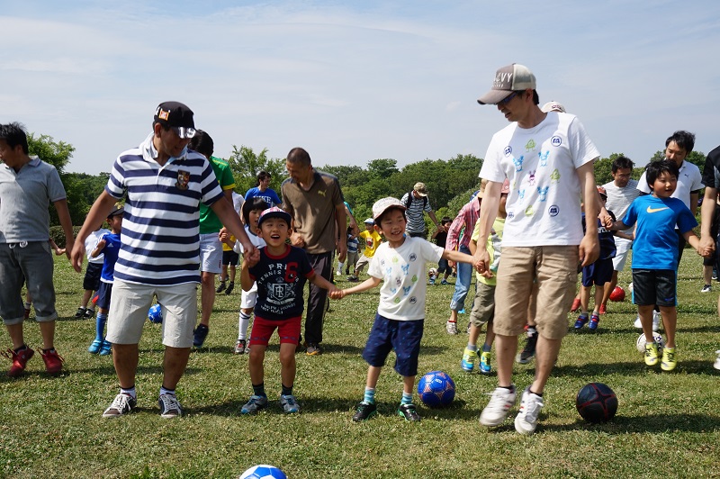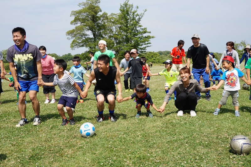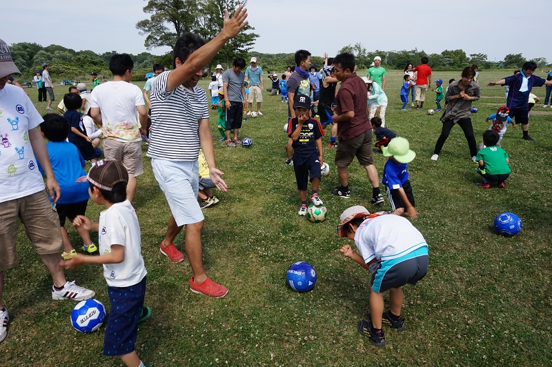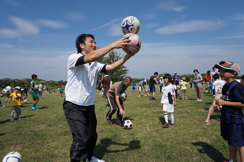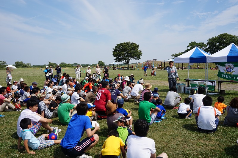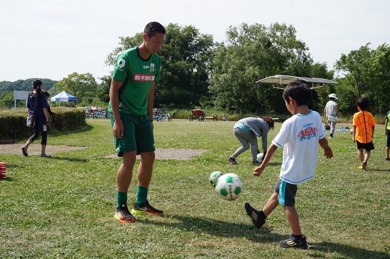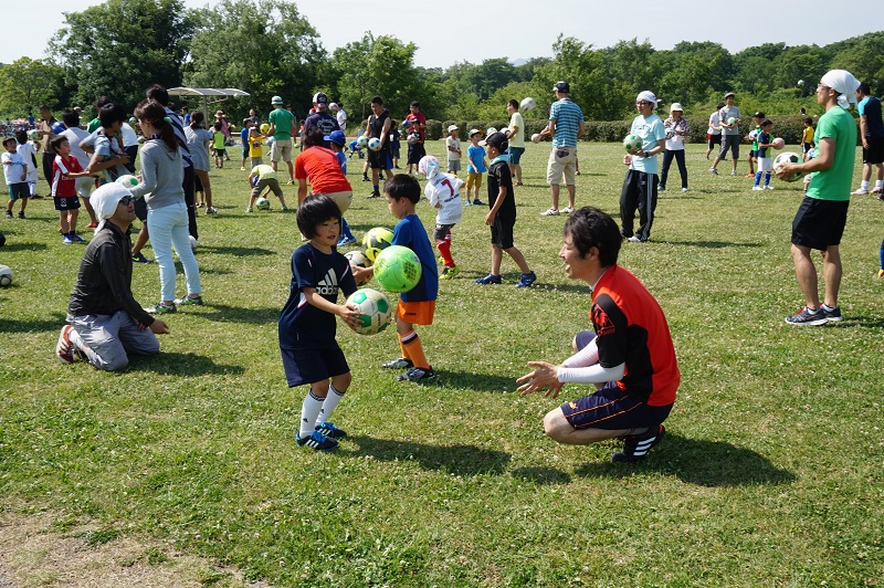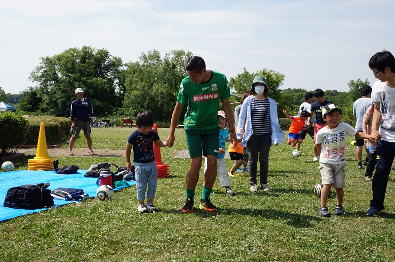 5月30日(土)各務原市の国営木曽三川公園かさだ広場にて木曽三川公園管理センター主催の親子サッカー教室が行われました。FC岐阜スクールコーチの他、今回はトップチームから小見恵吾選手、小川雄大選手が参加し、子どもたちや親御さんと一緒に汗を流しました。