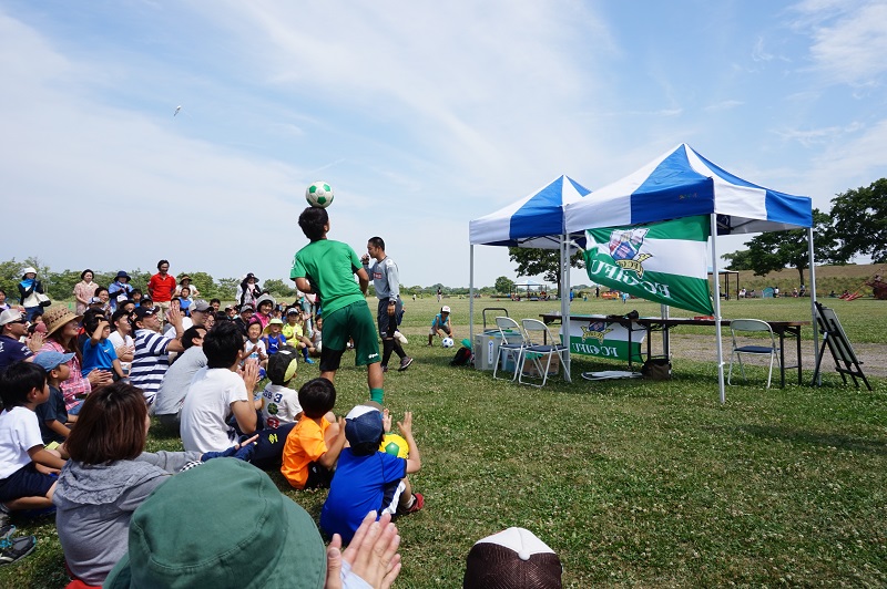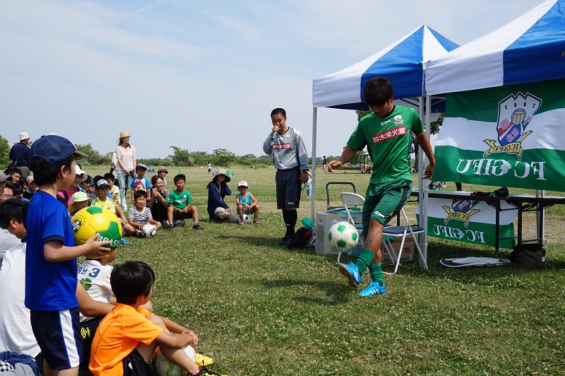 選手の自己紹介をかねて、小川選手が軽快なリフティングを披露!「お~、すごい!」間近で見るプロの技に拍手喝采!!