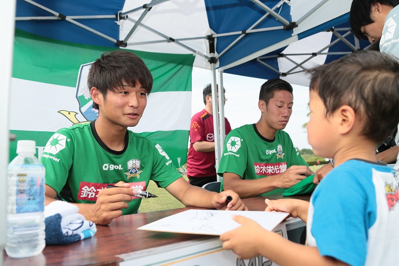 サッカー教室終了後は選手サイン会です。小見選手、小川選手からサインをもらい、子どもたちは大喜びでした。