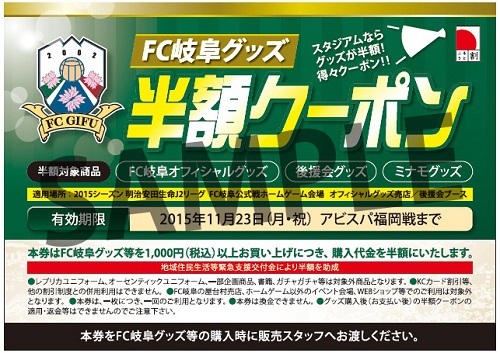 それに伴い、FC岐阜グッズ半額クーポンの発行及び配布を下記の通り開始いたしますのでお知らせいたします。
