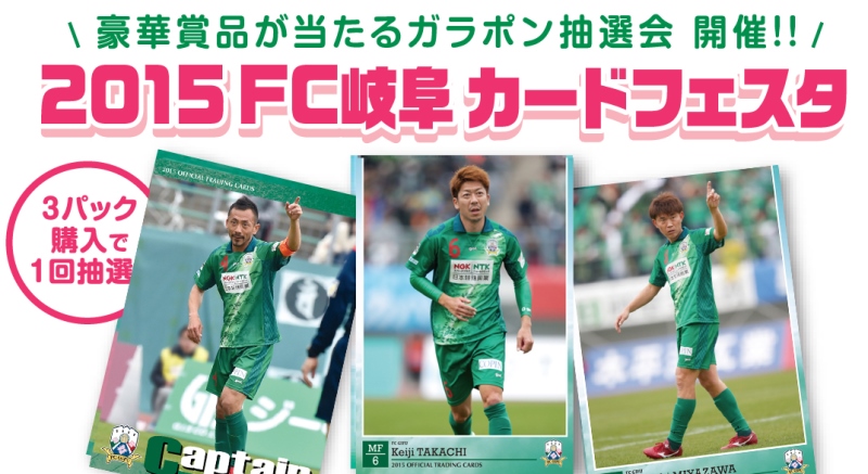 2015FC岐阜オフィシャルトレーディングカードの発売に合わせ、6月14日(日)vsコンサドーレ札幌戦にて、下記の通り「2015カードフェスタ」を開催いたします!当日は、3パックお買い上げごとに、豪華賞品が当たるガラポン抽選会に1回ご参加いただけます。豪華賞品は、選手直筆サイン入り試合球や選手私物などをご用意しておりますので、ぜひこの機会にお買い上げのうえ、ご参加ください。