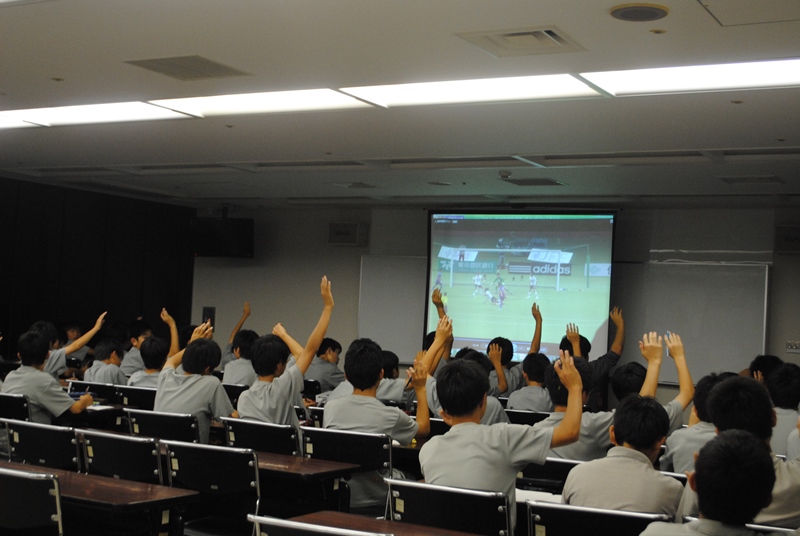 村上さんが主審として活躍されている映像を見たあと、Jリーグのプレー映像をみながら、ファウルなのかそうでないのか、イエローカードなのかレッドカードなのかなど、一人ずつジャッジしていきます。