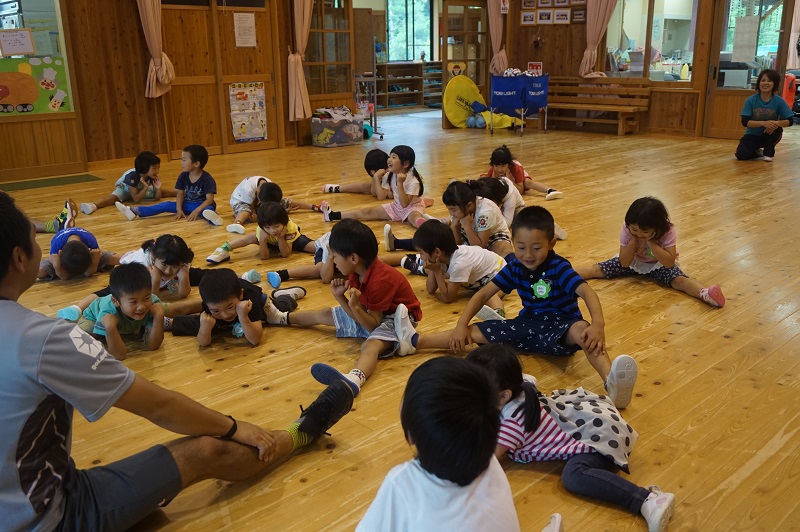 足を広げて、体を前屈します。子どもたちの柔軟性にコーチもびっくり!!