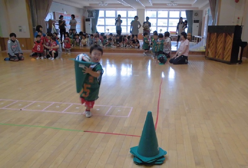 お友達にぶつからないよう、ケンケンで移動!コーチの笛で、止まることができたかな?