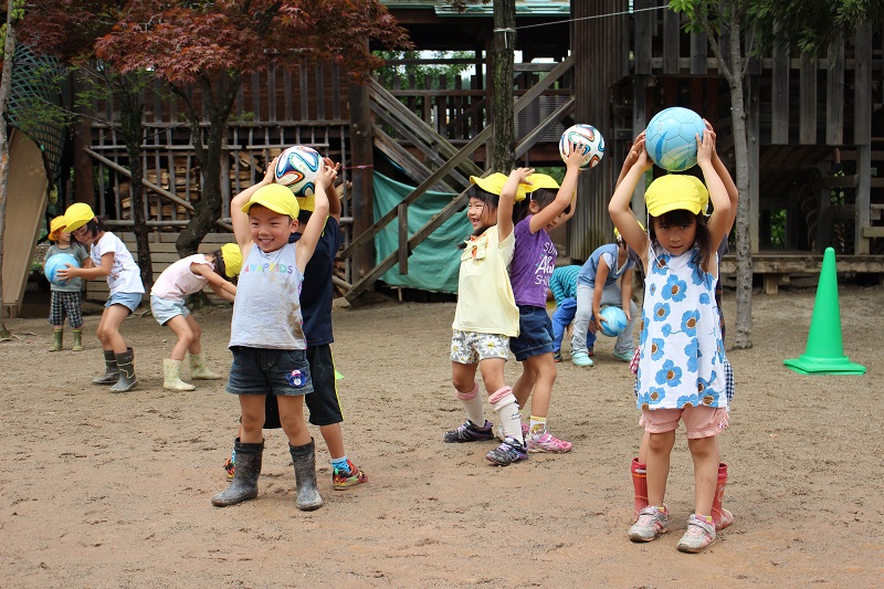 コーンの中にボールを納めて次のお友達に渡します。ボールを落とさず届けよう!