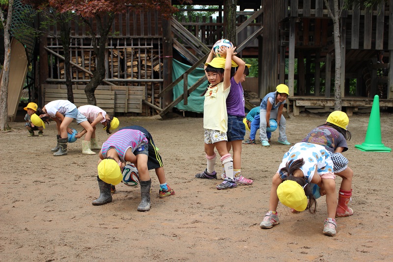 お友達と背中合わせになってボール渡し!「う~え!」「し~た!」元気なかけ声でチャレンジしました!