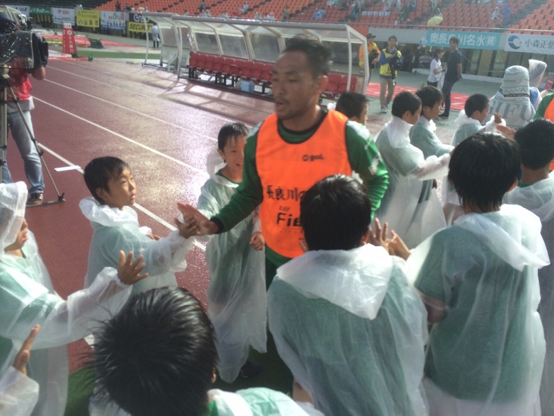 前座試合の後は、選手とハイタッチとウォーミングアップ見学を行いました。