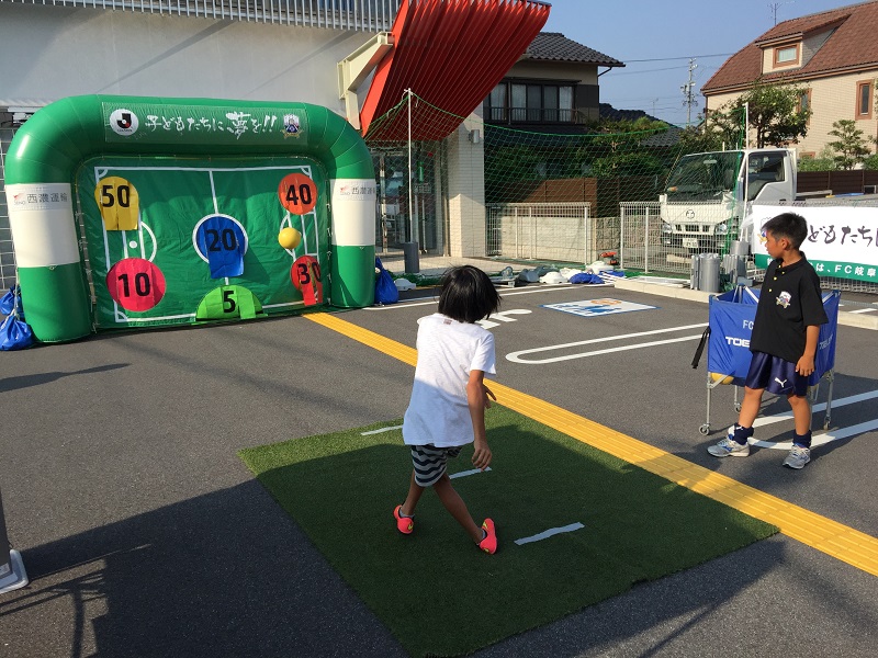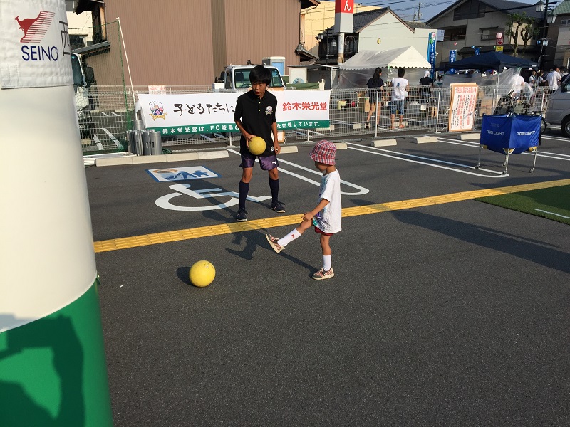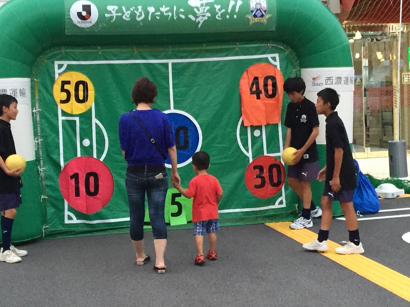 8月9日(日)岐阜市の鷺山本通りで「鷺山夏祭り大会」が開催され、FC岐阜ぎふ元気活動課によるキックターゲットが行われました。キックターゲットのルールは3球ボールを蹴って、打ち抜いた点数の合計得点に応じて景品をプレゼント!