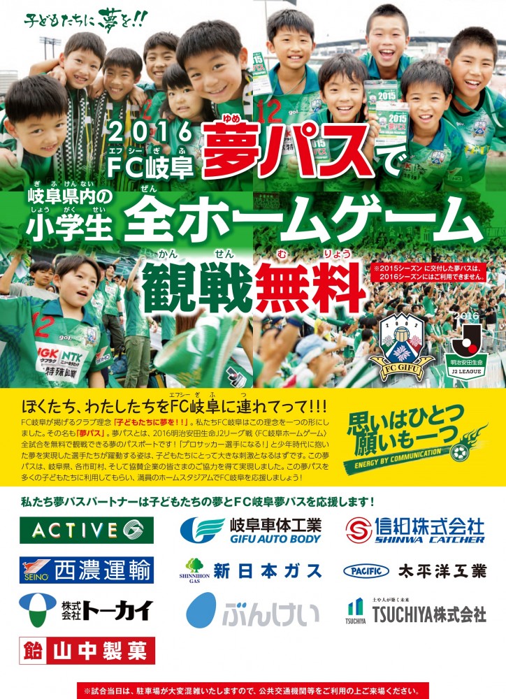 FC岐阜は、2016シーズンも岐阜県内の小学生がFC岐阜ホームゲーム(プレーオフ・天皇杯は対象外)をバック自由席(またはホーム自由席)で無料観戦できる「夢パス」を発行します。たくさんのお申し込みをお待ちしております!