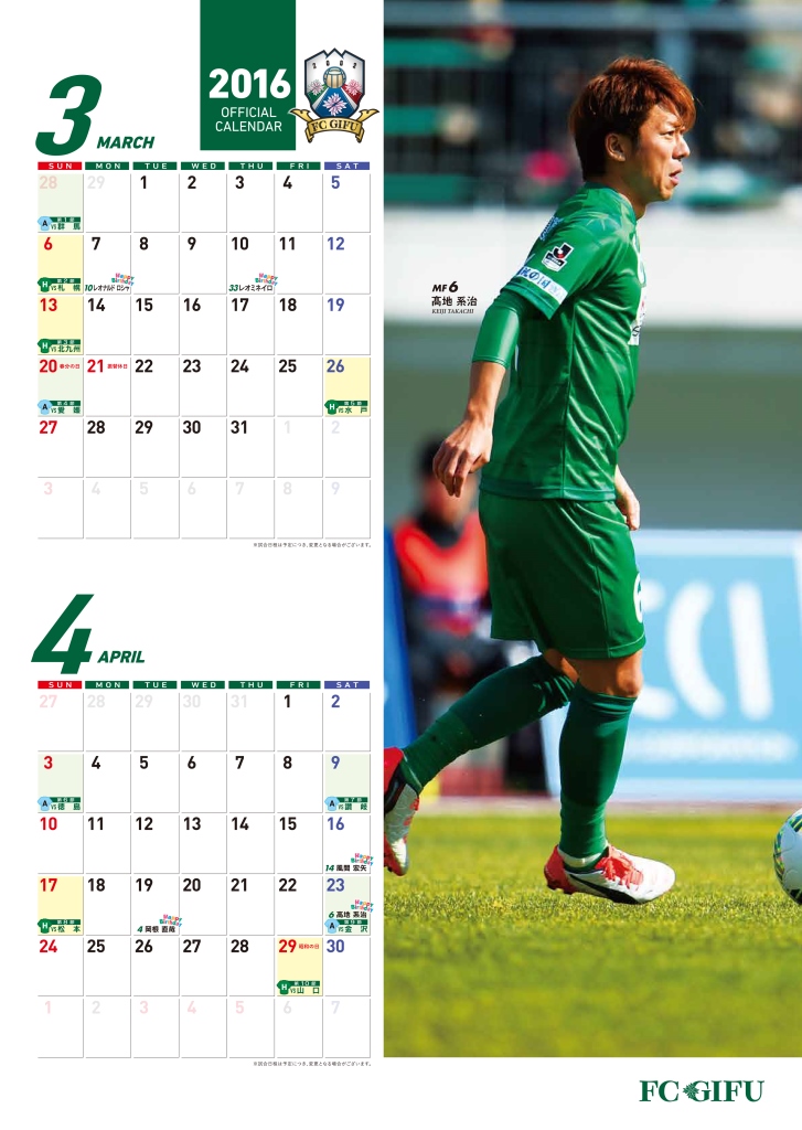 迫力ある選手のプレー写真を収録!選手の誕生日も記載しています。2016年をFC岐阜の選手と共に過ごしましょう!
