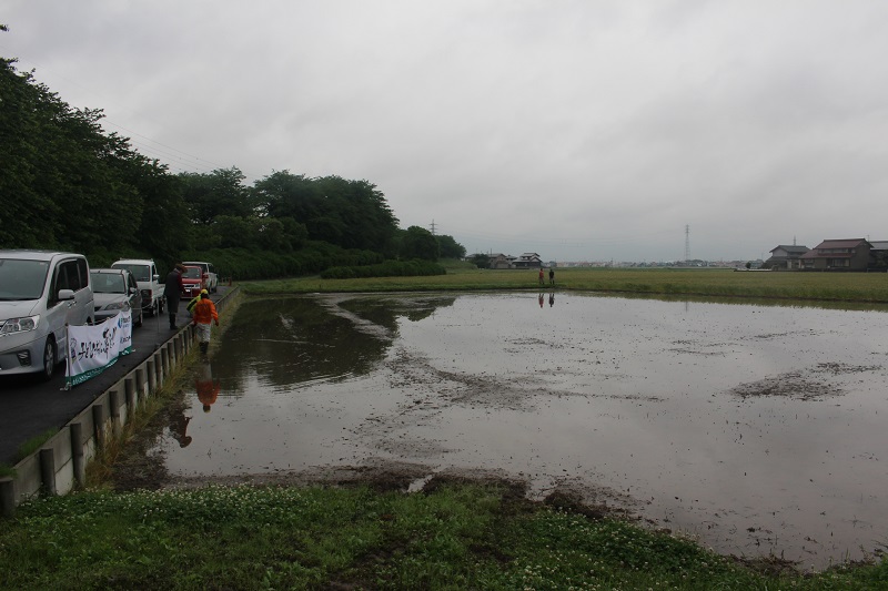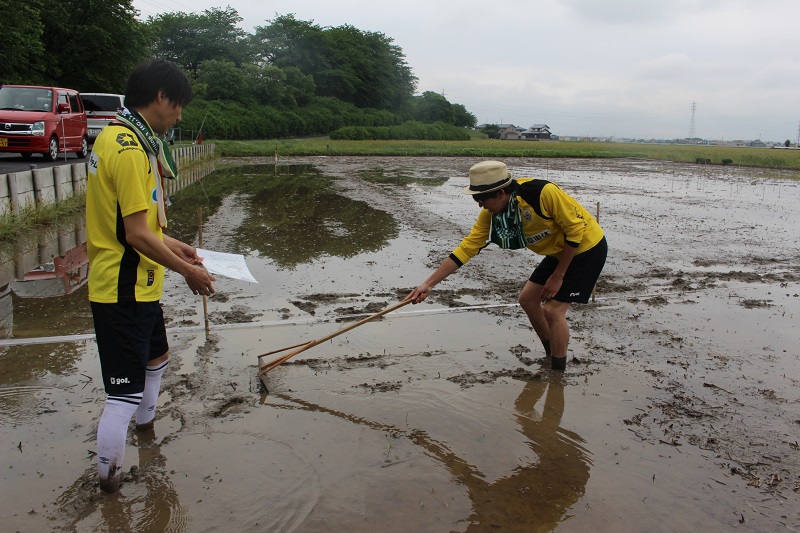 まずは下絵を描きます。その後、農家の方から15cm間隔で苗を植えるようにレクチャーをしていただき田植えが始まりました!