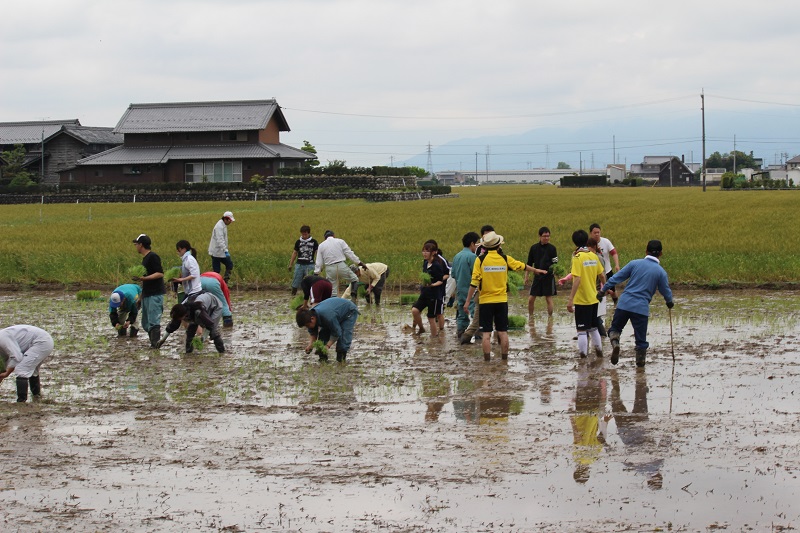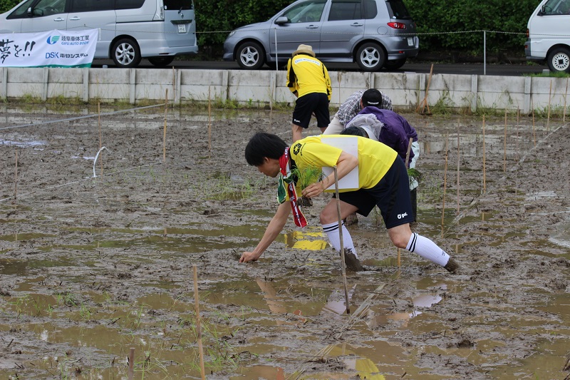近くにお住まいの方やファン・サポーターの皆さんと、ぬかるむ田んぼで四苦八苦しながら植えていきます!途中の休憩では輪之内町オリジナルの美味しい「おからドーナッツ」を、近くにお住まいの方やファン・サポーターの皆さんといただきました。