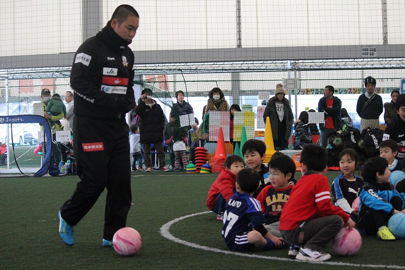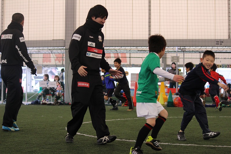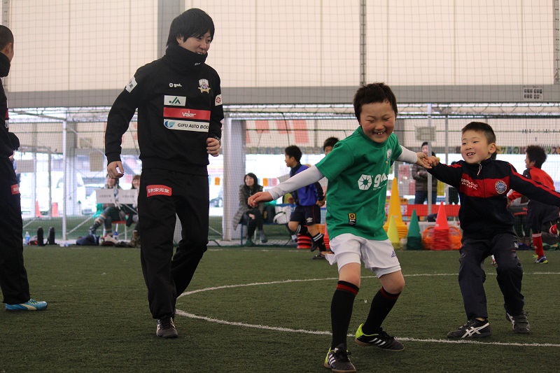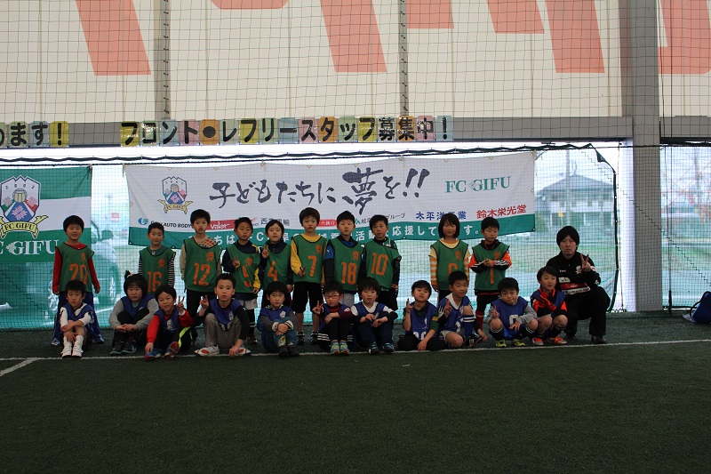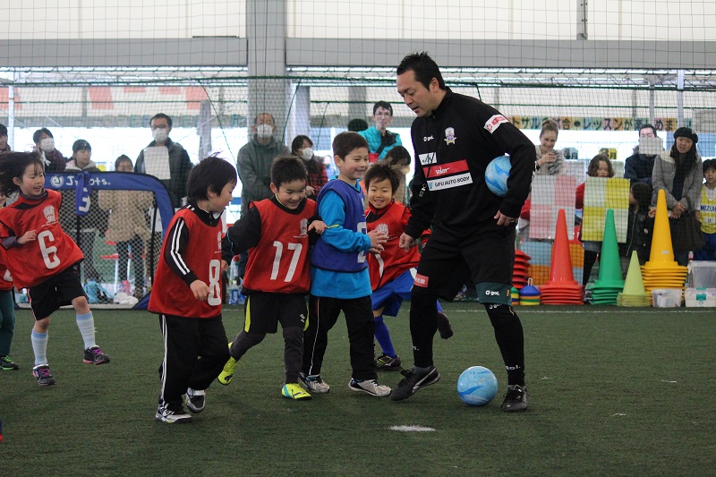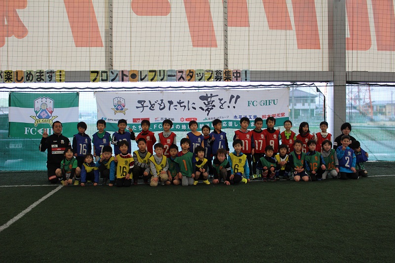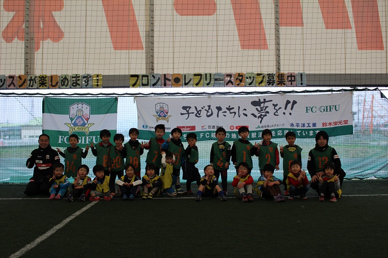 3月7日(土)本巣市にあるフットサルアリーナ本巣にて、年中児から小学4年生を対象にしたFC岐阜主催のサッカー教室が行なわれ、約130名の子どもたちが参加しました。