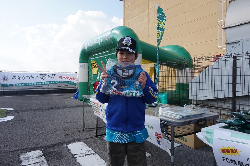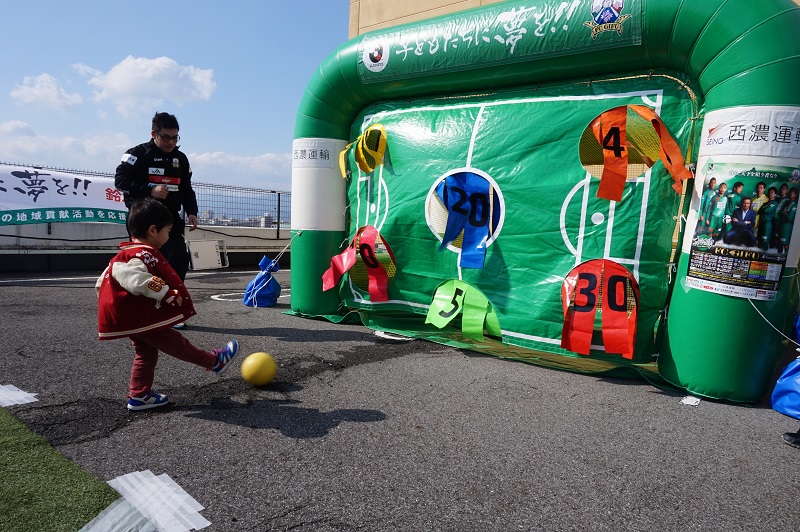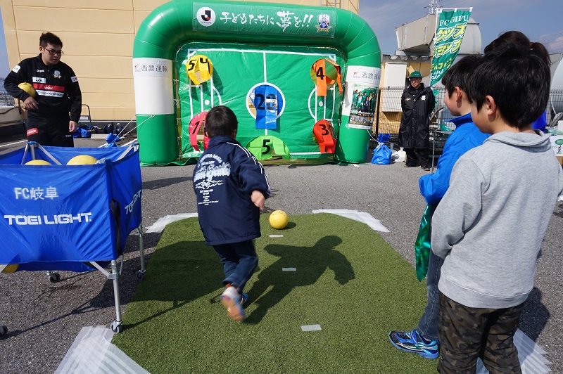 キックターゲットはボールを3球シュートして、合計得点に応じてFC岐阜のグッズがプレゼントされました。