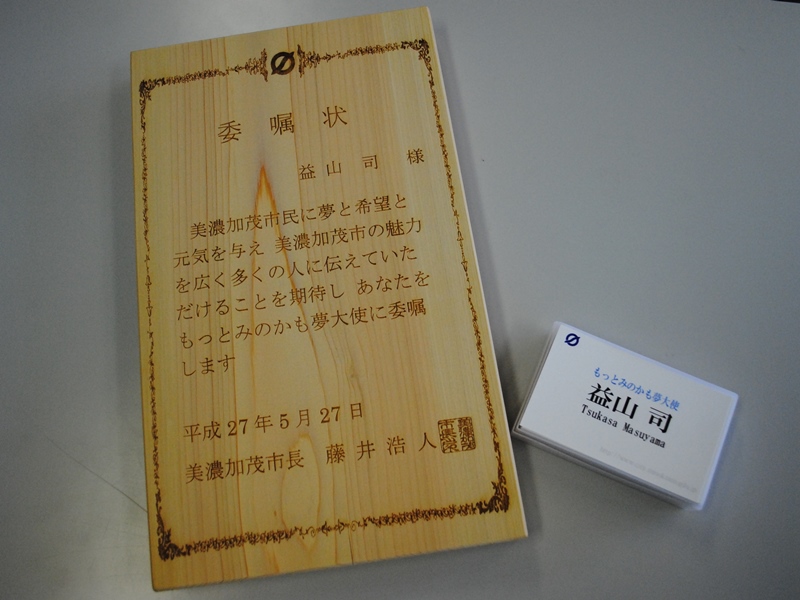 そして藤井市長より委嘱状が交付されました。この委嘱状は美濃加茂市の間伐材を使用したものです。名刺も頂きました。