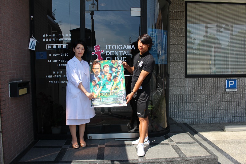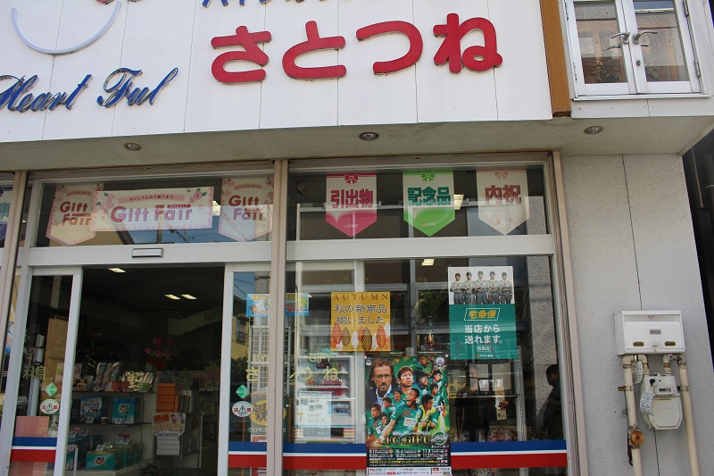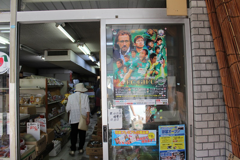 たくさんのサポーターにお越しいただけるように商店街にFC岐阜のポスターを張らさせていただきました。